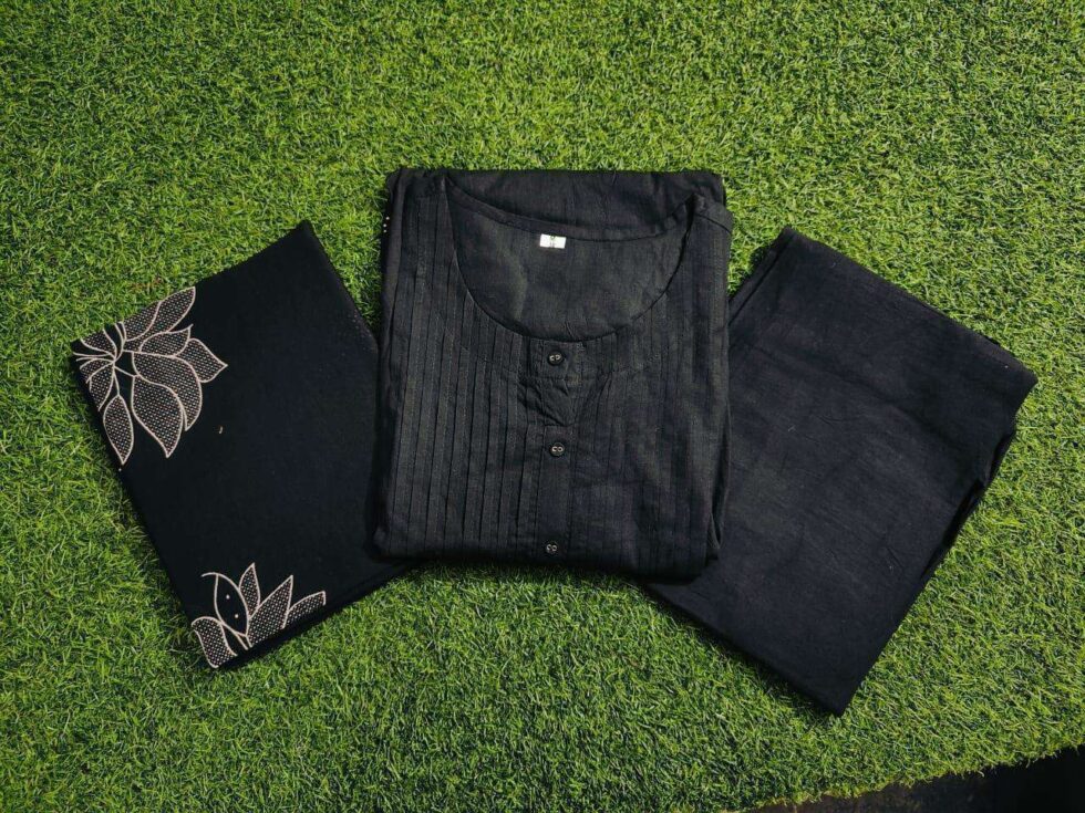 Chic Cotton Delight Black Long Kurta Having Discharge Floral Print & Printex With Pant & Dupatta Set