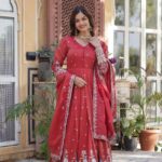 Elegant Viscose Cosmos gown with foil embroidery, zari, and sequins, featuring a fancy V-neck and full flair. Includes matching embroidered dupatta.